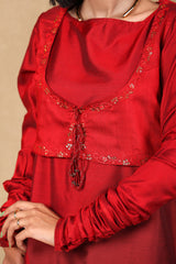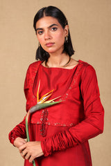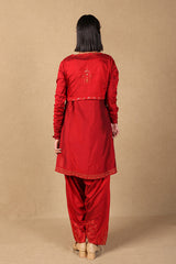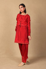 A fitted shirt with churidaar sleeves and boat neckline, along with a koti with exquisite embroidered detailing on the hems as well as tassels to tie at the front. The shirt features embroidered motifs and detailing at the shirt hem. Paired with a classixc fit shalwar with embroidered motifs on shalwar hems.