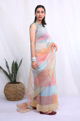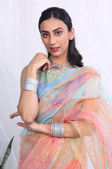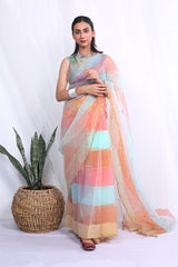 Mulit colour organza saree with all over speckled gold detailing along with scalloped edges, paired with a printed sleeveless blouse. The pallu is 106 inches and the sari is 8.8 ft in length.
