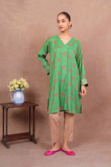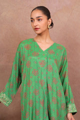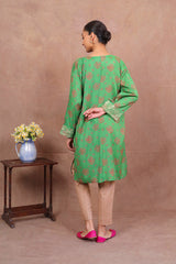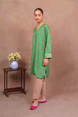 Loose-fit printed kurta with front pleat detail and embroidery on sleeves and blanket stitch on neckline.