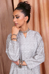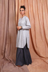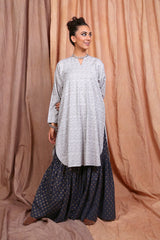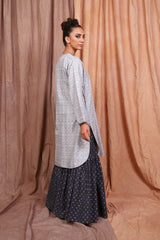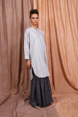 A jaquard pattern tunic, with crew neck with slit, full sleeves and pleat details.