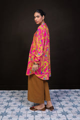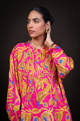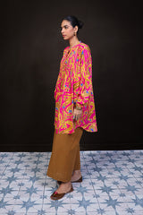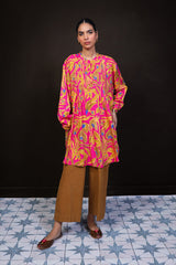 Printed tunic with pleating detailin on front, cuffed sleeves and band neckline.
