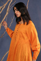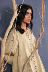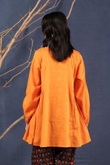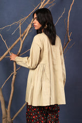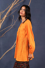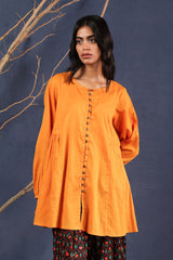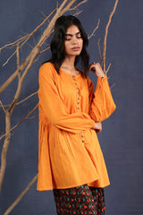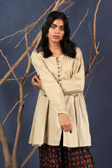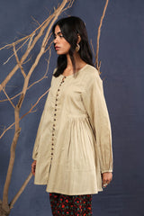 A loose fit flared peplum top with round neckline, featuring buttons along the front placket and gathers at the waist.