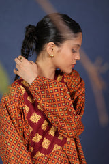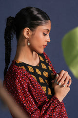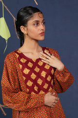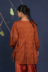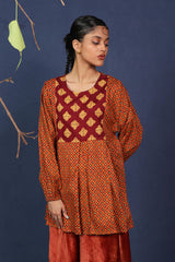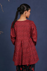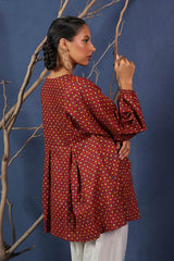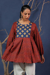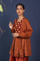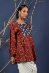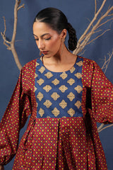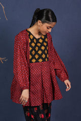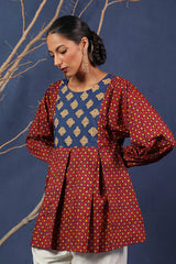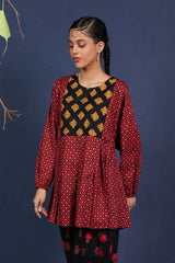 A loose fit round neck peplum kurti with box pleats at the front and back, featuring a print blocked bodice detail along with full length peasant sleeves.
