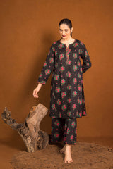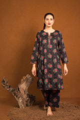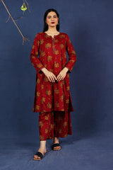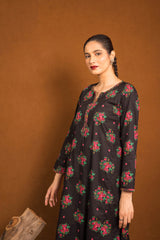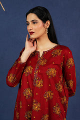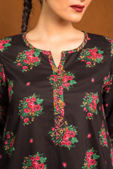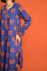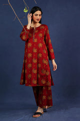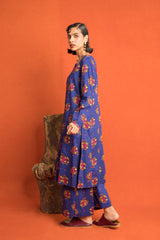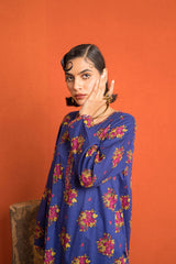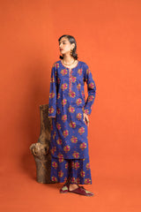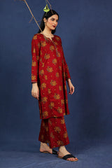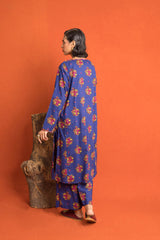 An loose fit A line kurta with all over print detail featuring a round neckline with V slit with print blocked piping detail on neckline and sleeve hems. Paired with a matching printed culotte trousers.