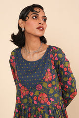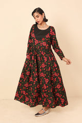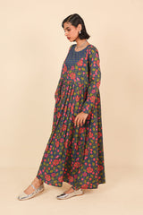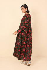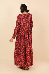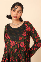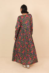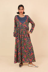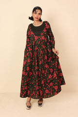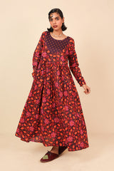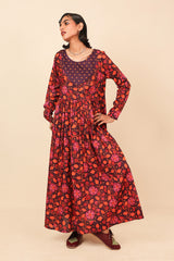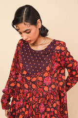 An all over printed flared dress with a fitted print blocked bib neckline detail, featuring gathers at the front and button detailing at sleeve hems and front bodice.