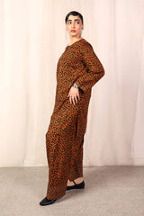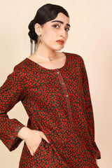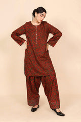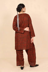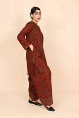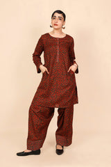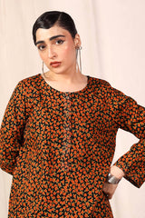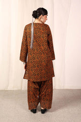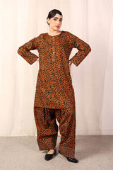 A loose fit printed shirt with round neckline, featuring buttons along the front placket and side pocket detail. Paired with a matching classic fit shalwar.