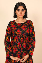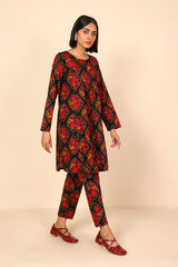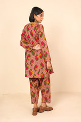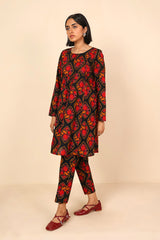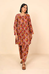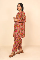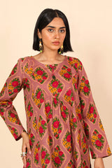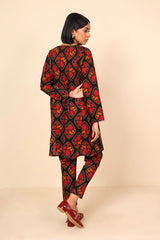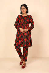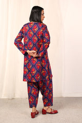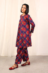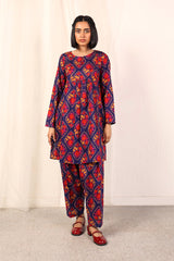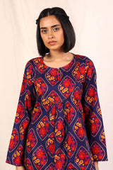 A loose fit flared printed shirt with round neckline, featuring stitch details in faux bib necklinewith gathers at the waist. Paired with a matching printed straight fit shalwar.