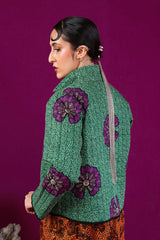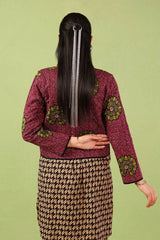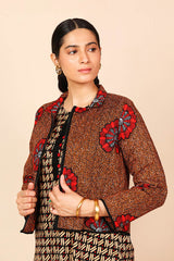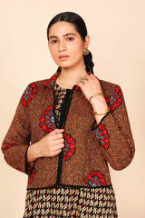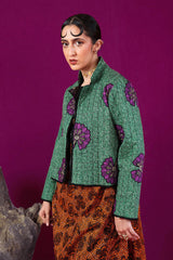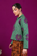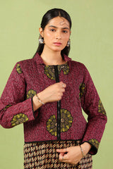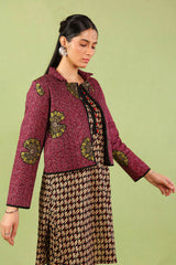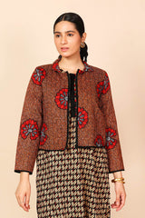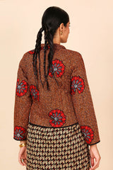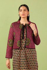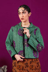A fitted printed collared jacket with padded quilted details, cropped at the waist along with zipper details at the front.