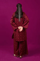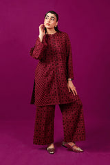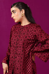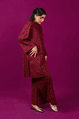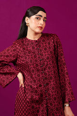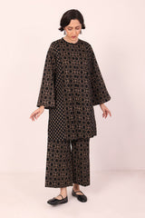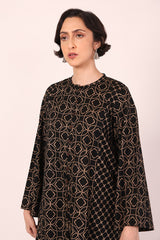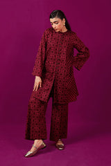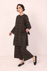 A loose fit printed front open panelled shirt with round neckline, featuring buttons along the front. Paired with a matching printed culotte trousers.