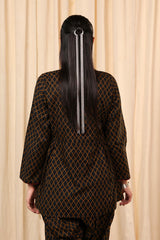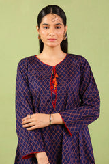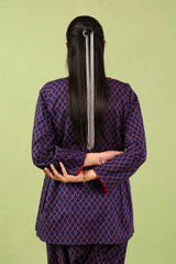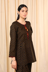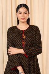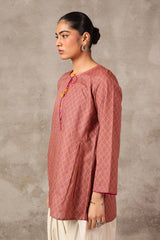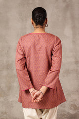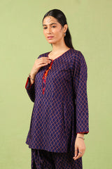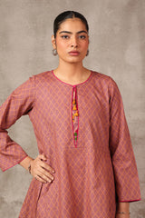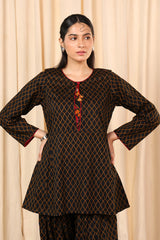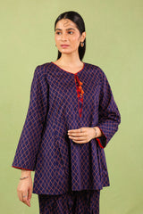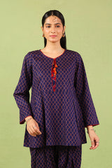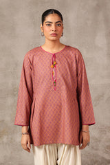 A fitted printed top with round neckline and print blocked feature on the bodice, featuring piping details and tassel on the front.