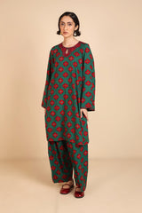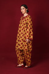 A loose-fit, printed kurta with round neckline featuring detailed embroidery on keyhole and neckline, and on sleeves hem. Paired with classic loose-fit shalwar.