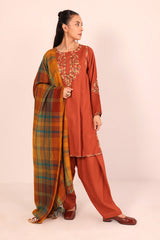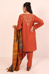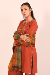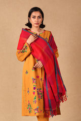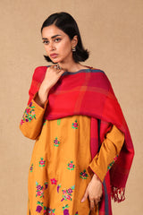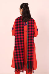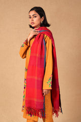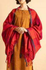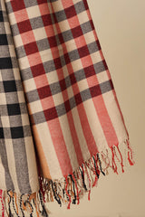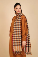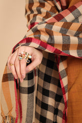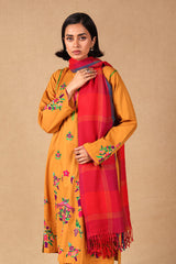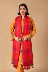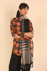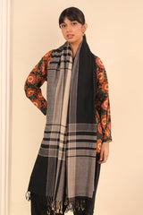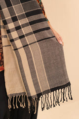 A yarn dyed shawl with woven print details and fringe detail, perfect for pairing with any of your outfits this season.