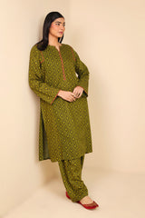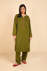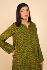A solid geometric pattern printed kurta with ribbon pipping and round neckline. Paired with classic fit shalwar.