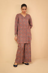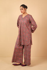 Printed, V-neckline shirt with buttons on neckline. Paired with loose fit printed pants.