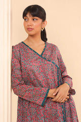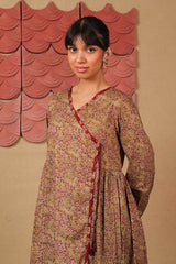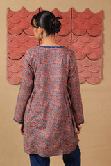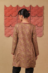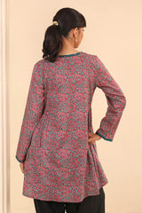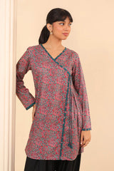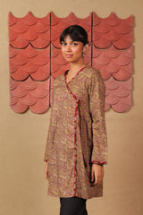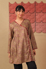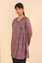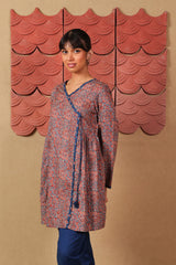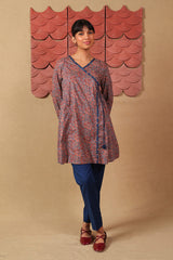 Printed Assymetric neckline shirt with side gathers and dori tassel.