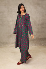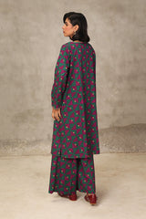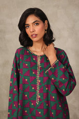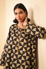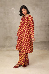 A loose fit printed flared shirt with round neckline, featuring embroidered detailing at neckline. Paired with printed loose culotte pants.