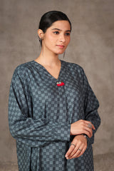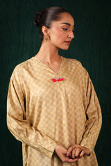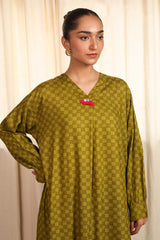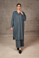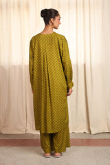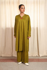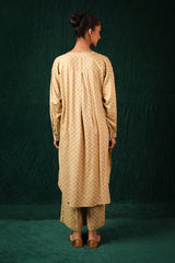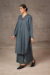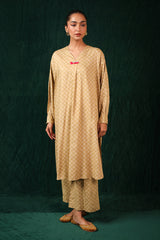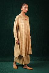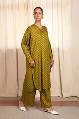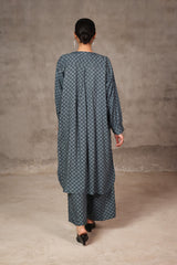A loose fit printed shirt with V neckline and cuffed peasant sleeves. Paired with matching printed culotte trousers.