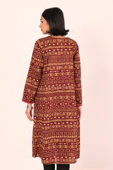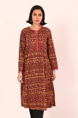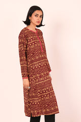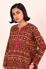 A loose fit printed kurta with round neckline with V slit along with solid colour dory detailing on neckline and sleeve hems.