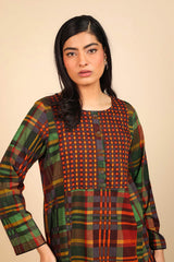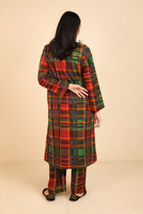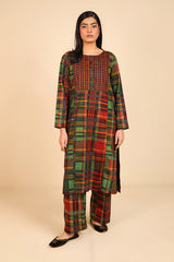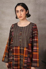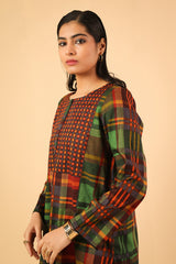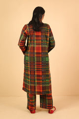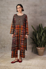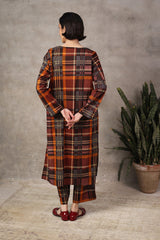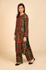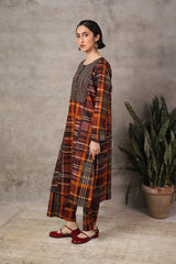 This woven straight-cut check style kurta features round neckline with placket and buttons on it. Teamed with loose straight-fit trousers.
