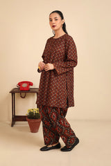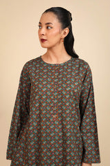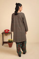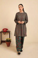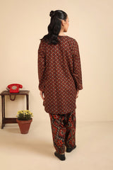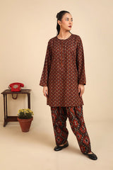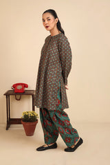 An iconic ikkat-inspired panaled kurta with round neckline, embellished with buttons along the front placket. Paired with classic contrasting printed shalwar, detailed with running stitches at the ankles.