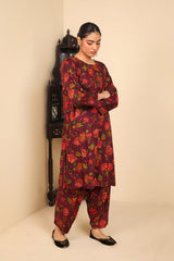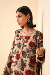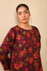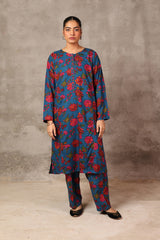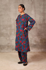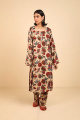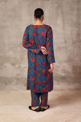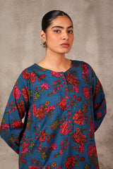 A loose printed shirt with round neckline, featuring buttons along the front. Paired with matching printed culotte trousers.