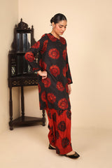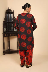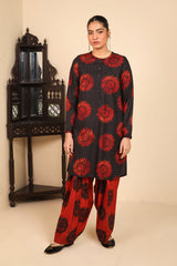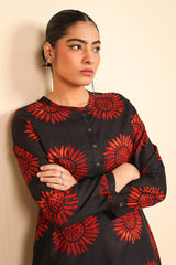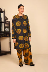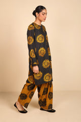 Sunflower cordset featuring a classic round neckline adorned with buttons on the placket on the front and cuff sleeve. The radiant floral print adds a charm, making it perfect for a bright and breezy statement. Paired with a classic shalwar trimmed with running stitch around ankles.