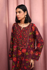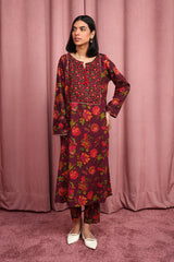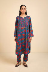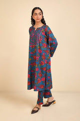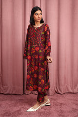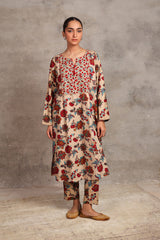 A classic-loose fit floral printed kurta with round neckline and v-slit embellished with tassel.Subtle embroidery on front and sleeve hems . Paired with printed straight-fit trousers.