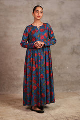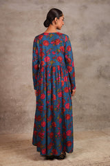 chintz printed long, flared frock featuring round neckline, embellished with tassel and pipping.Gathers around waist gives the perfect flow.