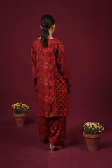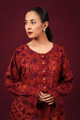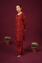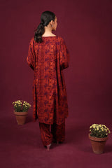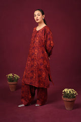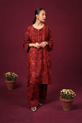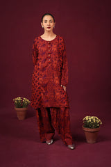 A self-printed shirt with a round neckline, featuring a buttoned placket and loose-fit sleeves. Paired with matching loose straight trousers for a comfortable yet stylish look.