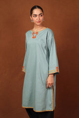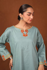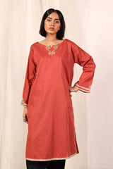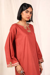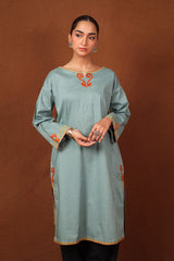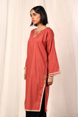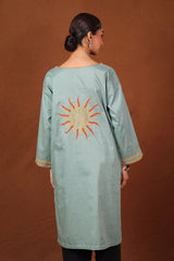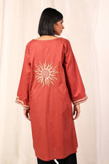 A loose fit shirt with colour blocked detail on round neckline and sleeves along with motif on back.