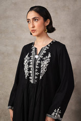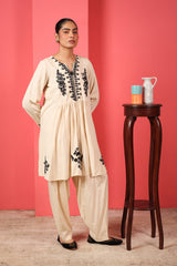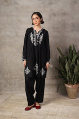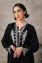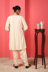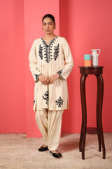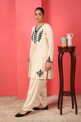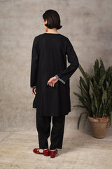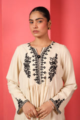 A loose -fit panelled, medium-length shirt with gathers above the waist, featuring a round neckline and a v-slit. The intricate embroiderey around neckline highlights delicate fish stitches. Paired with a classic-fit shalwar.