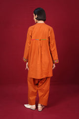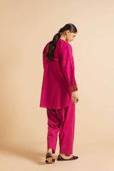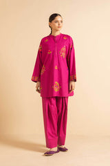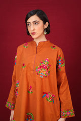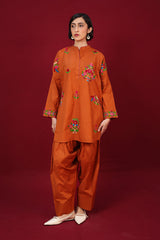 This suit features a medium length a-line kurti with a band collor and a placket, subtly detailed with embroidery. This kurti is adnorned with a vibrant cluster of flowers and intricate embroidery on the sleeves boarders. Paired with pegged shalwar.