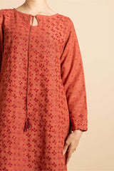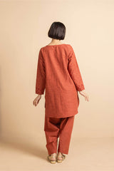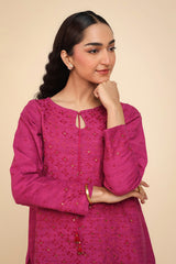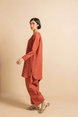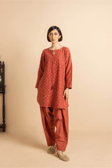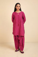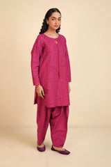 A straight-cut, medium-length self-embroidered kurta enhanced with sequin work on front and sleeves. The kurta features round neckline and keyhole stule embellished with tassal. Paired with matching loose classic-fit shalwar.