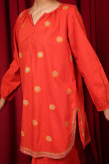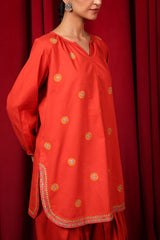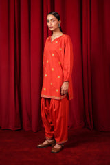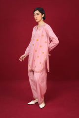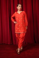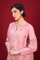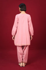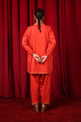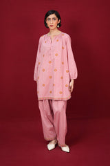 A loose-fit paneled shirt with a round neckline and a V-slit features intricate all-over embroidery detailing. The embroidery extends to the shirt’s hemline, further enhanced with delicate hand-stitching details, gathers around the neckline, and cinched sleeves. Paired with solid straight trousers.