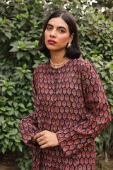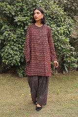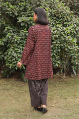 A handmade ajrak printed co-ord set featuring a straight-panel printed shirt with a round neckline and button placket. Paired with contrast printed wide-leg trousers.