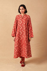 A paisley seamless ajrak printed kurta with a round band neckline and V-slit, featuring loose sleeves and a long silhouette. Paired with matching printed straight-fit trousers for a coordinated, stylish look.