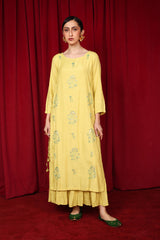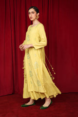 An exquisite formal long kurta in a rich solid hue, featuring a round neckline. Delicate floral sequin work graces the front, adding a subtle shimmer, while long tassels on the sides bring a graceful movement to the silhouette.