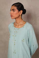 A delicate fusion of elegance and ease, the Chandni Sequin Kurta Set features a loose-fit embroidered kurta with a classic round neckline. The neckline and front placket shimmer with subtle sequin embellishments, while scattered floral sequin motifs add a soft radiance throughout. Comes with an inner. Paired with wide-leg trousers adorned with matching hued sequin motifs, this ensemble exudes effortless grace..