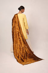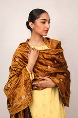 Designed in soft, luxurious velvet, this shawl features intricate Marorri taanka embroidery along the borders, accented with delicate tassels at the corners. Its elegance makes it a perfect pairing for both formal and semi-formal attire.