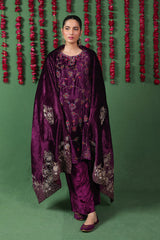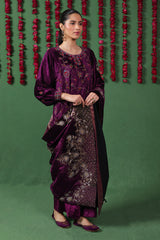 This exquisite velvet shawl is enhanced with Marorri and velvet taanka embroidery with hints of gold and silver. The shawl is adorned with shimmery purple zarri finishing.