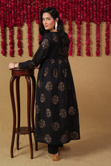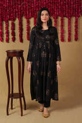 A fitted panelled flared dress with all over motif detailing and round neckline, featuring an attached koti detaling with mukaish detailing and gathers at the waist. Paired with a matching straight fit trouser.