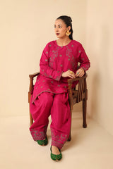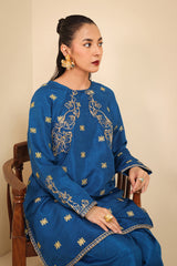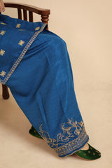 A signature ensemble, this formal dress features a round neckline kurta adorned with intricate golden taanka embroidery highlighing the bodice, sleeves and back. Paired with wide-leg trousers detailed with embroidery on ankles and a slip (Inner).