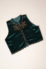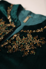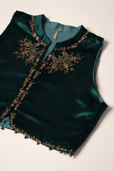 A velvet chaand koti with a band neckline, embellished with sequin and taanka work on the neckline, front slit, and the koti’s hem. The open front features chaand motifs on the neckline and back, adding an immortal touch of refinement and grace.