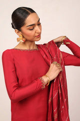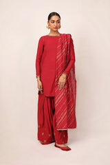 A classic-fit solid-hued formal kurta features a round neckline, adorned with delicate golden taanka and colorful sequin work on both the neckline and sleeve hems. Paired with matching solid-hued wide-leg trousers, enhanced with golden embroidered motifs at the bottom, comes with an inner (shameez) for ease. The look is completed with a printed pattern dupatta, enhanced with a golden frill trim.