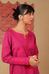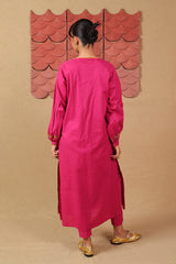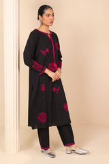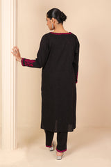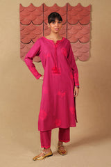 A loose fit shirt with round neckline with V slit, featuring embroidered motifs all over on speckled base and embroidery details on sleeve hems, along with tassel detailing on the front. Paired with a solid straight fit trouser with embroidery on trouser hem.