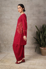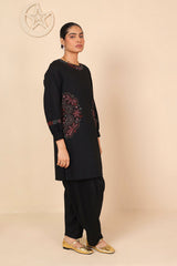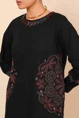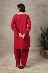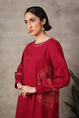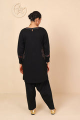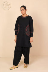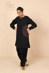 A loose fit shirt with round neckline and cuffed peasant sleeves, featuring embroidery detailing on neckline, sleeves and side chaaks. Paired with a solid classic fit shalwar.