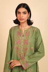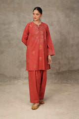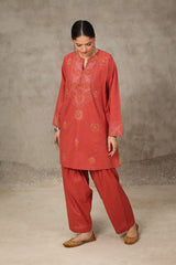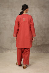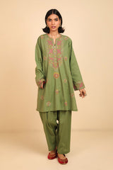 A loose fit tunic with round neckline with V slit, featuring all over embroidered details on the bodice and sleeves. Paired with a solid classic fit shalwar.