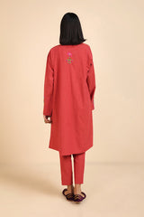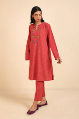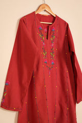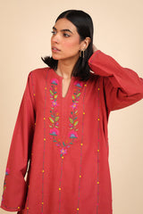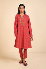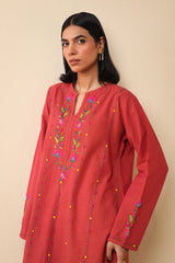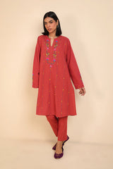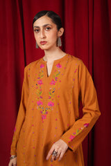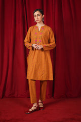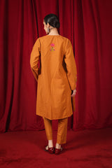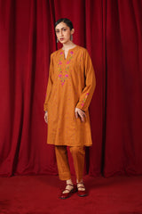 A divine A-line kurta featuring a round band neckline with a V-slit, adorned with vibrant hand-crafted gulzar-e-naqsh embroidery on the bodice and kurta. The intricate details extend to the sleeves and back, adding a touch of charm. Paired with classic straight trousers for a graceful look.
