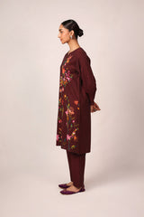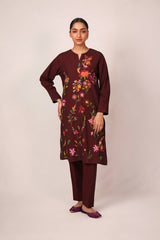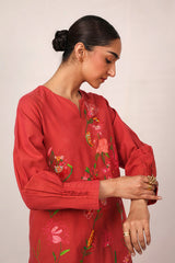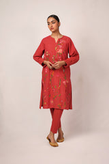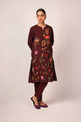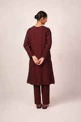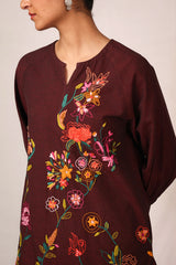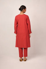 A straight-fit, solid-hued kurta features a round neckline with a V-slit, adorned with vibrant, handcrafted floral bails adding a pop of colour to the design. The sleeves are enhanced with gathers, adding a delicate touch. Paired with matching solid-hued straight-fit trousers, this ensemble combines artistry with subtle elegance.