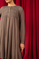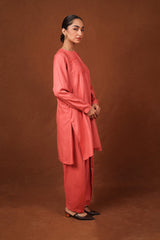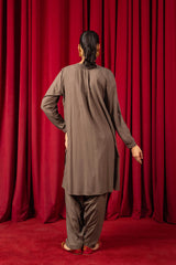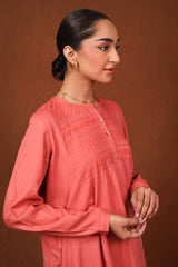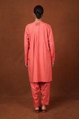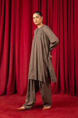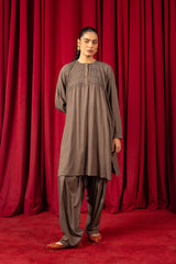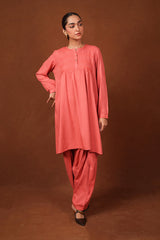 A classic loose-fit solid colour kurta, adorned with round neckline followed by intricate pleates enhanced with self-embroidery . Paired with loose fit-pegged shalwar.